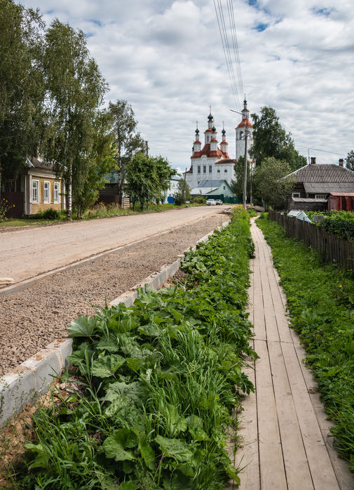 Тотьма – один из не столь многочисленных северных русских городков, в котором, кроме стандартной советско-постсоветской “городской среды” (основными признаками которой являются запущенность и отсутствие городской среды как таковой) сохранились некоторый северный шарм, привычные для русского севера деревянные тротуары (хотя их осталось немного, и их стали недавно массово заменять на асфальтовые с бетонными бордюрами: видимо, так можно бюджет побольше “освоить”) и впечатляющие архитектурные жемчужины (подобное впечатление производит, например, еще Каргополь). Небольшой и очень провинциальный сегодня, с населением чуть менее 10 тысяч жителей, этот город занимает удивительное, неожиданное для многих и сильно подзабытое место в русской истории.